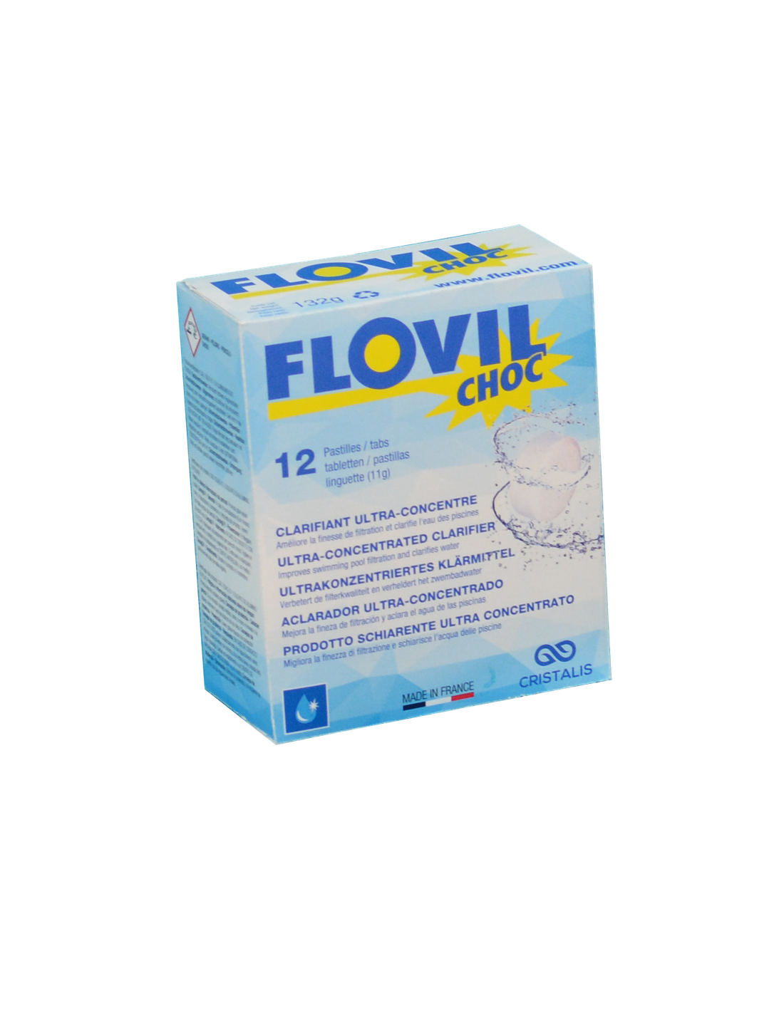 FLOVIL CHOC est un floculant en pastilles qui optimise la finesse de filtration des filtres à sable, à cartouches et à poche jusqu’à 5 microns : les microparticules en suspension dans l’eau se regroupent par attirance électrostatique et forment des précipités filtrables.